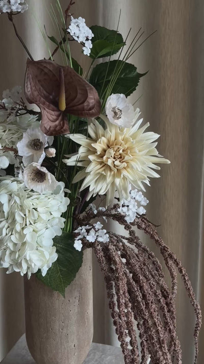 En skulpturell bukett i dempede naturtoner. Sammensatt med fokus på form, balanse og tekstur – designet for å fungere som et rolig, men tydelig blikkfang i rommet