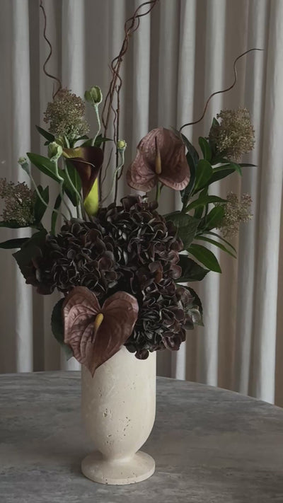 En skulpturell bukett i myke, dempede bruntoner. Tørket hortensia kombineres med anthurium og calla for et rolig, arkitektonisk uttrykk. Naturlig, sofistikert og tidløs – laget for moderne interiører og rolige rom.