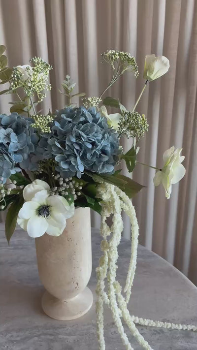 Cloud er en elegant og skulpturell bukett der myke blå hortensia møter rene hvite blomster og lette grønne grener. Den luftige komposisjonen balanserer fylde og bevegelse, mens de lange hengende amarantus-stilkene skaper en vakker, naturlig kaskade.