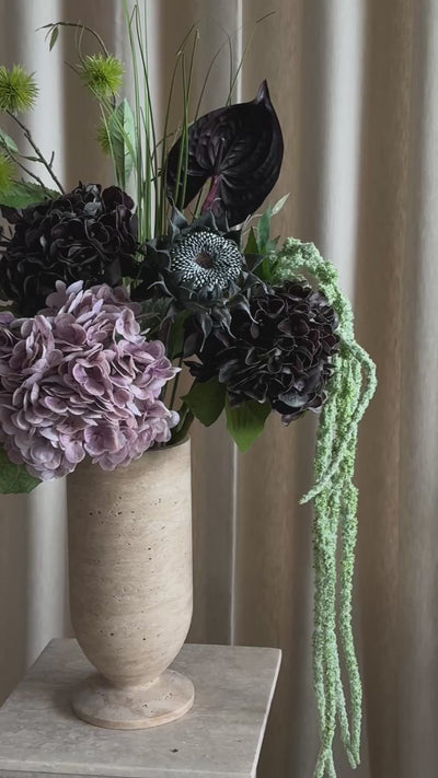 En nydelig bukett av kunstig lavendel i en harmonisk blanding av lilla og mørke lilla toner, med friske grønne innslag. Buketten er elegant og naturtro, og lengden på stilkene kan enkelt tilpasses slik at den passer i både små og store vaser. Et flott dekorativt innslag som bringer ro og skjønnhet til hjemmet – helt uten stell.