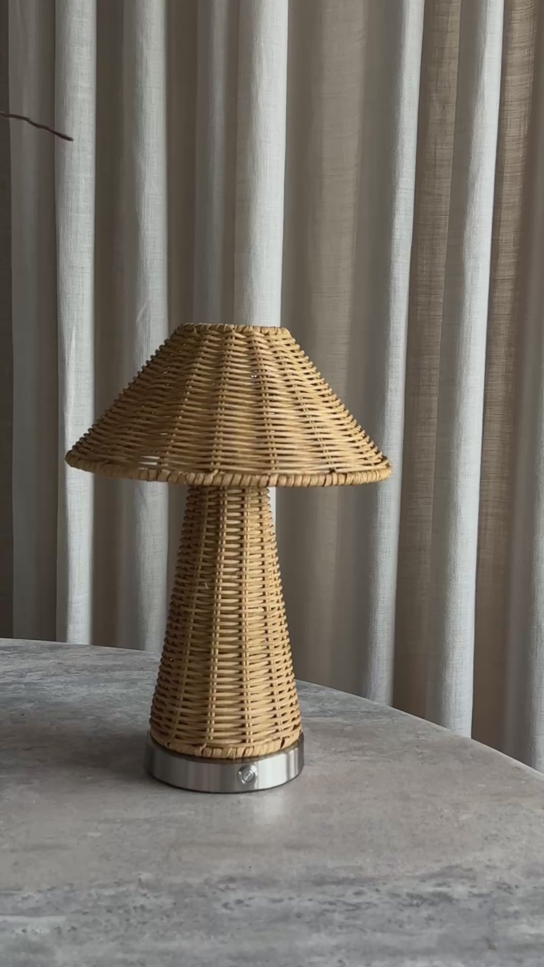 En trådløs bordlampe med naturlig uttrykk og tidløs eleganse. Den håndflettede skjermen i rotting gir et mykt og varmt lys, mens basen i børstet messing tilfører et eksklusivt preg. Lampen lades enkelt med USB-C og kan dimmes etter behov – perfekt både inne og ute, der du ønsker en stemningsfull belysning uten ledninger.