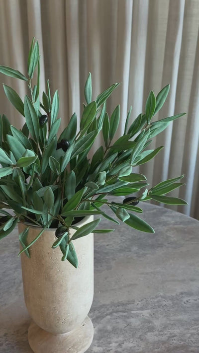En tidløs olivenbukett som bringer et rolig, middelhavsinspirert uttrykk inn i hjemmet. De slanke, støvgrønne bladene kombinert med de mørke olivenene skaper et naturlig spill som føles både sofistikert og avslappet.